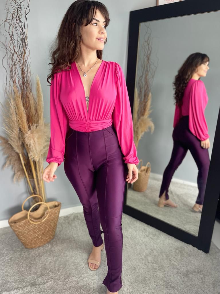 O tecido tem fluidez, o que garante uma modelagem perfeita e muito confortável, possui toque gelado, e tem leve brilho no tecido.